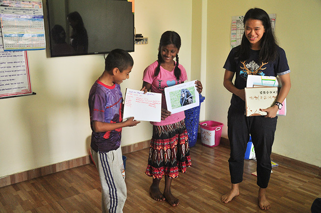 Not only did they hold creative workshops for our kids, they also learnt to cook Nepalese food, doing house chores, and trying to understand Nepal in different perspectives by visiting different local projects such as plastic recycling, street kids association, animal rescue centre etc.